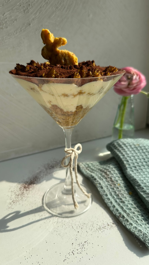 Karottenkuchen kann jeder. Tiramisu auch. Aber Karottenkuchen-Tiramisu — mit selbstgemachter veganer Mascarpone , einer Vanille-Eiercreme die so unfassbar lecker ist & kleinen Hasen-karottenkuchen obendrauf?